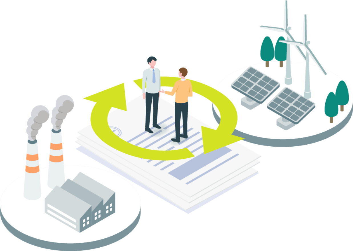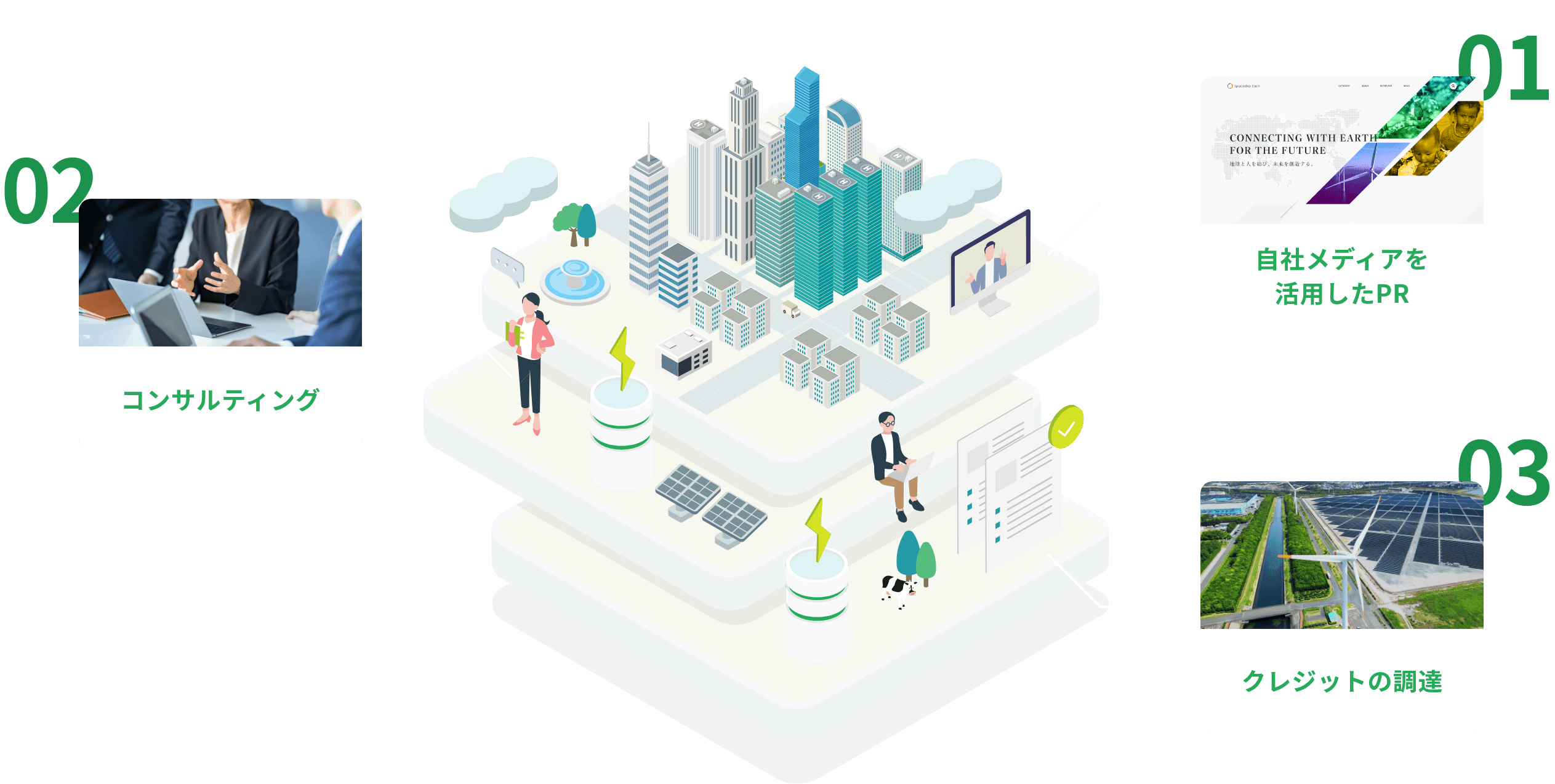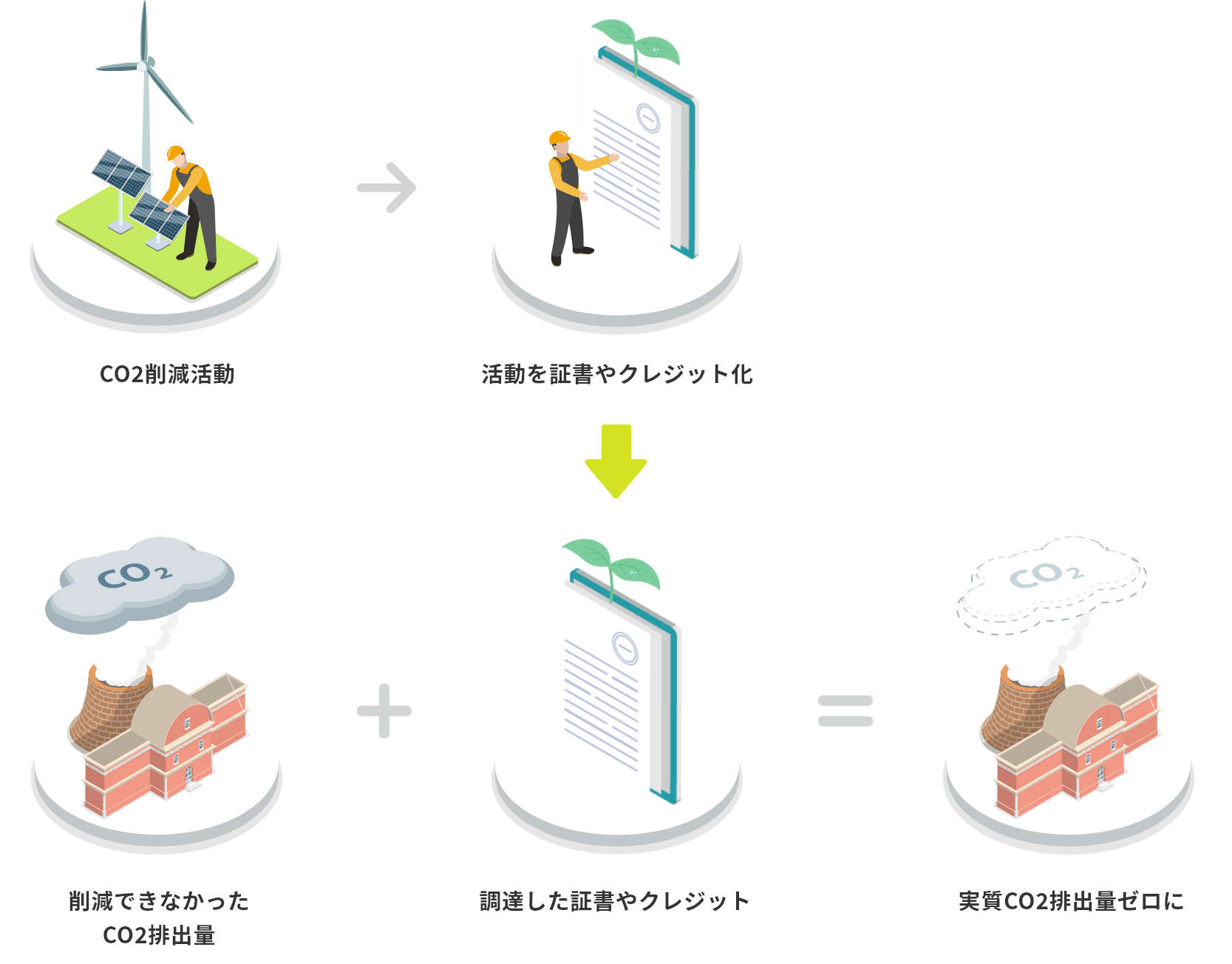 企業努力による削減が困難な温室効果ガスに対して、他者で生み出したCO2削減量を取引できる形(証書やクレジット)にし、